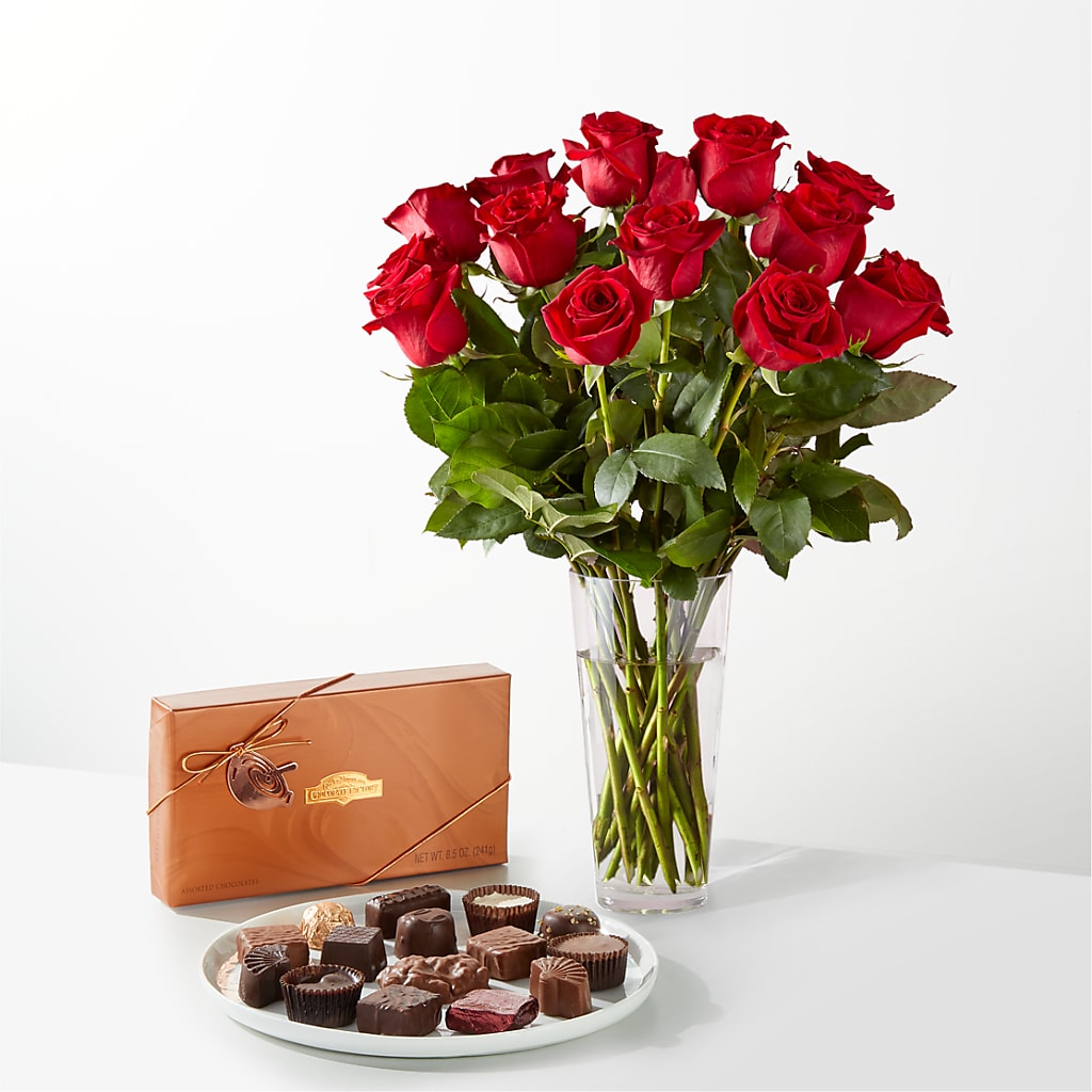 A bouquet of 12 roses and foliage paired with a gift box of assorted chocolates.